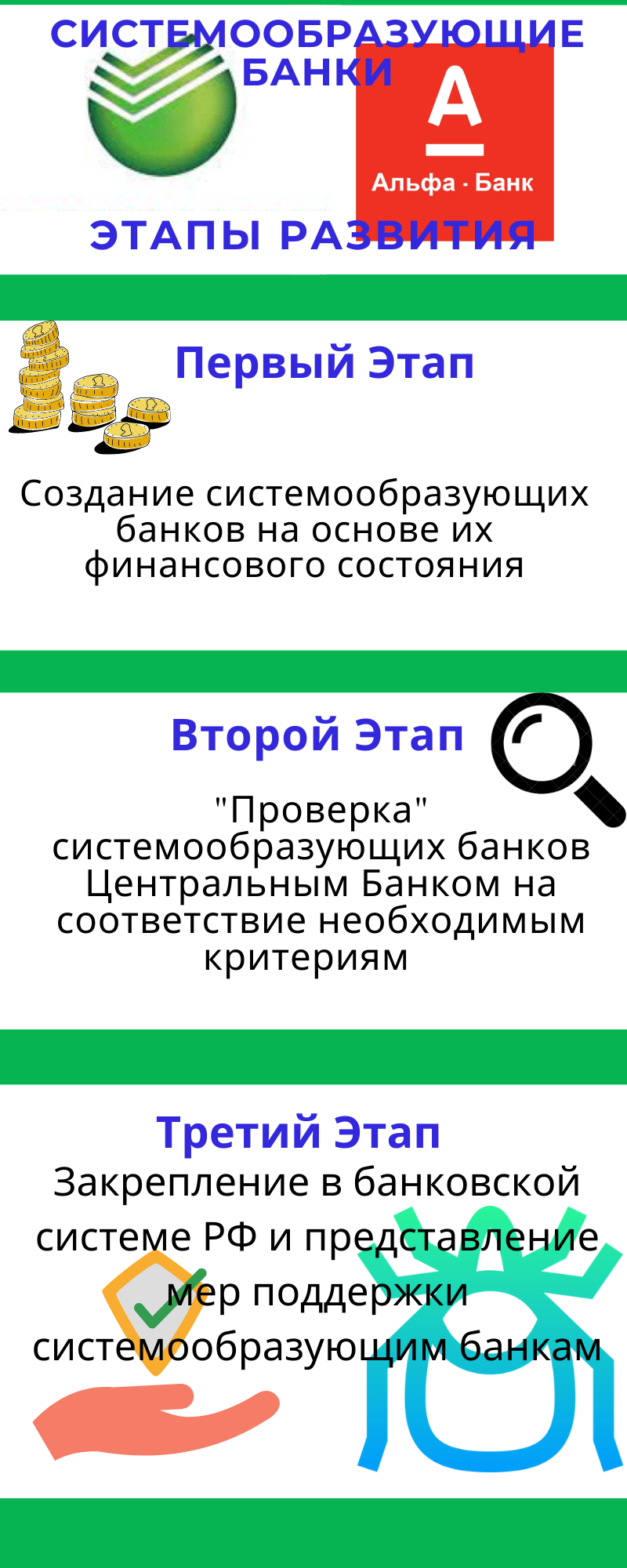 Третьим и финальным этапом являлось закрепление подходящих системообразующих банков в банковской системе РФ, а также обеспечение поддержки этих банков со стороны Центрального Банка.