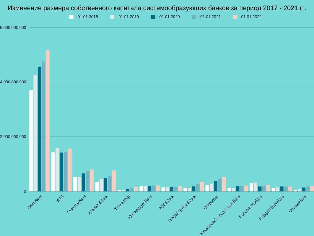 За период в 5 лет, собственный капитал практически всех системообразующих банков значительно вырос, несмотря на введение санкций