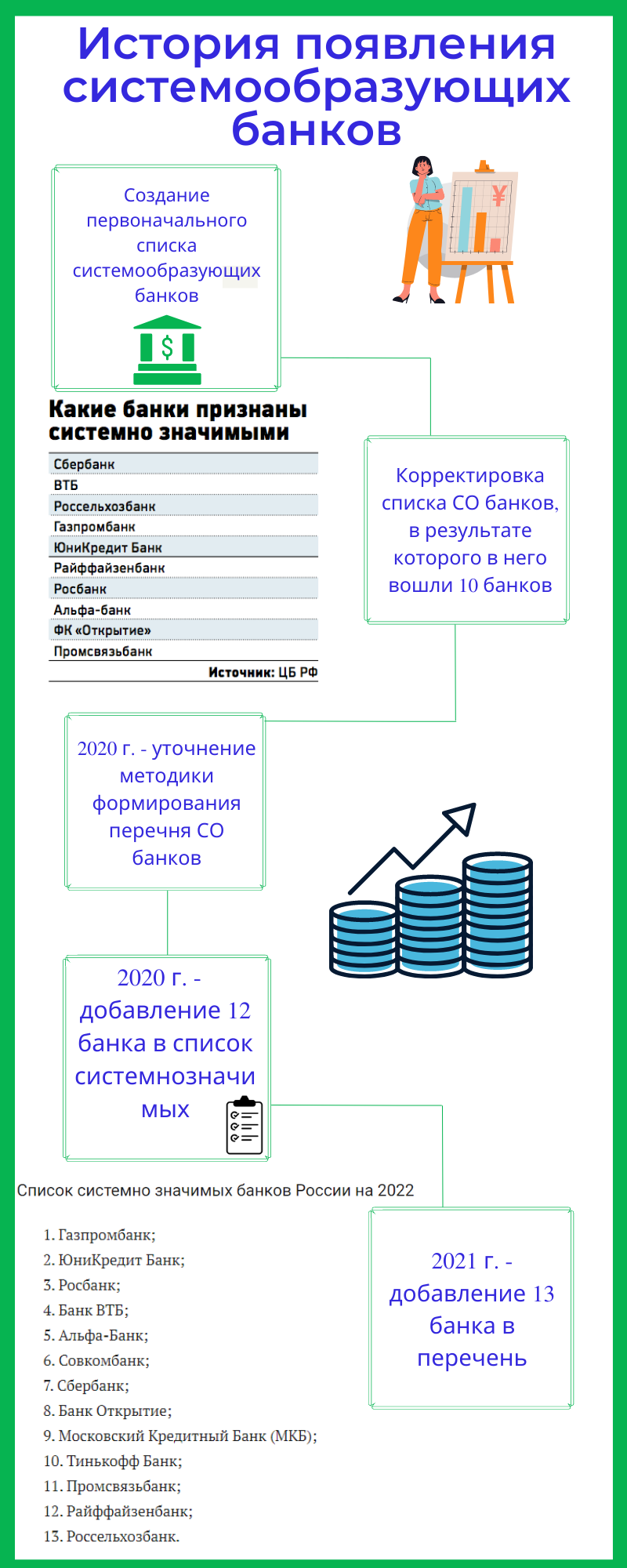 В 2014 г. Россия испытала тяжелый финансовый кризис. Именно это масштабное происшествие заставило государство задуматься о том, чтобы принять меры, которые помогут избежать дальнейшего ущерба экономике. Одним из таких решений стало создание списка системообразующих банков, чтобы обеспечить устойчивость финансовой системы государства при возникновении чрезвычайных ситуаций.
